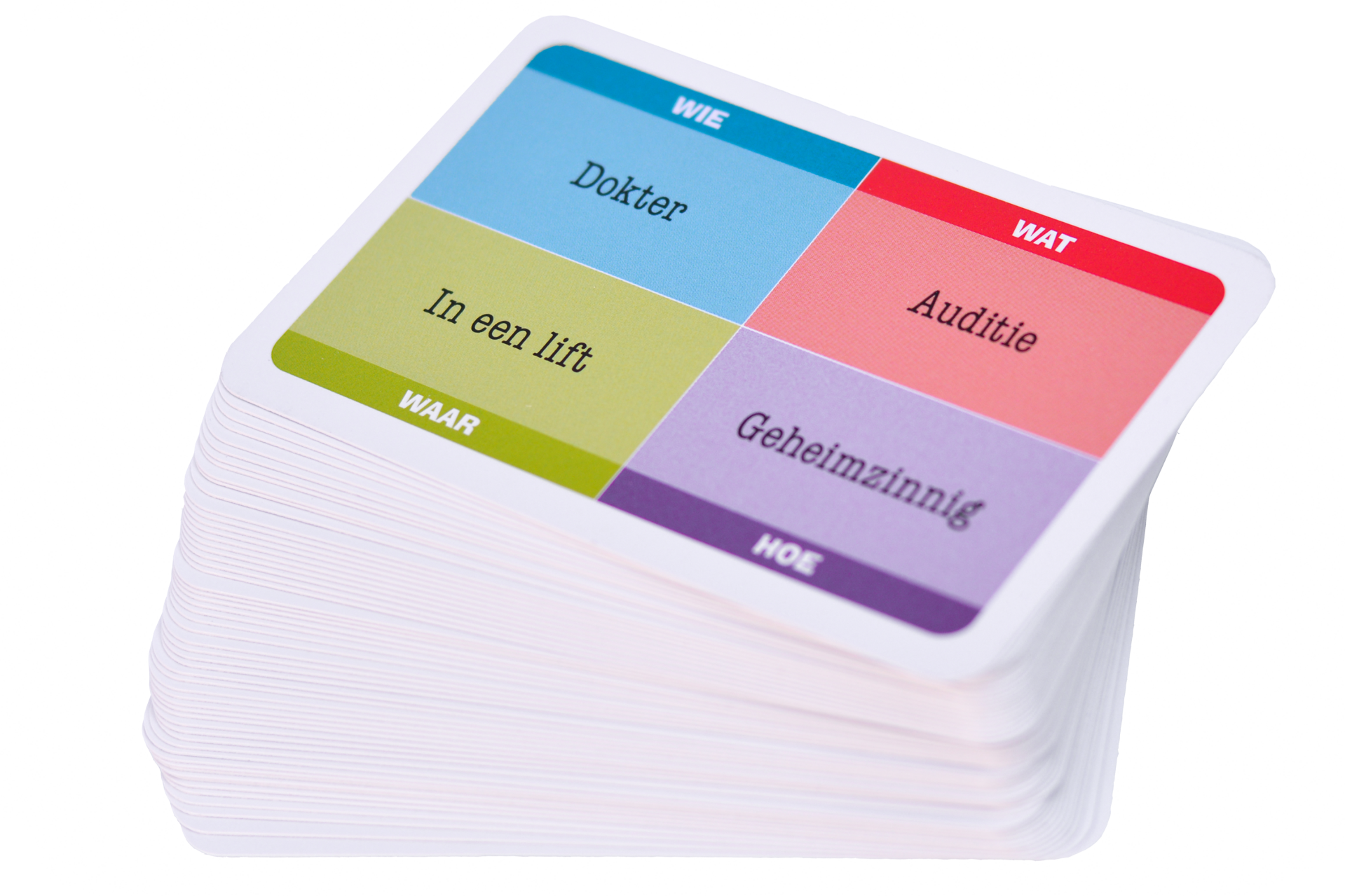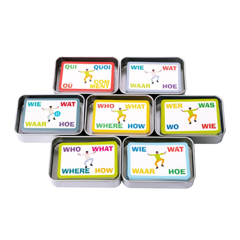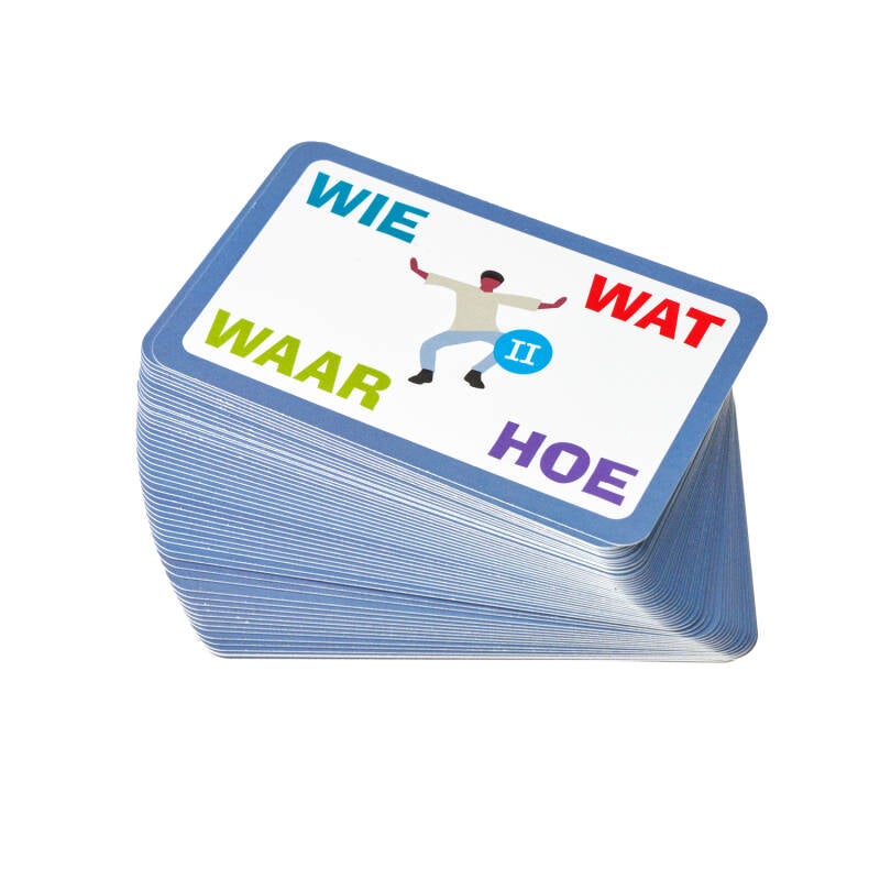 Drama Nerds Improvisatiekaartjes zijn goed voor eindeloos improvisatie- en taalplezier voor iedereen van 6 tot 100 jaar. Gebruik ze bij het improviseren, het vertellen van verhalen, als inspiratiebron bij creatief schrijven of voor taal- en raadspelletjes. Er staan 4 begrippen op elk kaartje. Je hoeft deze begrippen niet te combineren, maar dat kan natuurlijk wel. Gebruik twee of meer begrippen van hetzelfde kaartje of combineer woorden van verschillende kaartjes. Zo heb je meer dan 9 miljoen mogelijke combinaties! Met WIEWATWAARHOE kun je dan ook eindeloos verhalen en scènes maken. Er zitten 55 WIEWATWAARHOE-kaartjes in een blikje en er bestaan 10 varianten: