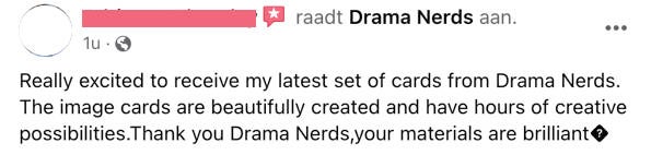 Ik gebruik veel van het materiaal van Drama Nerds in mijn dramalessen. Het is echt steengoed en zeer tof materiaal, dank je wel!