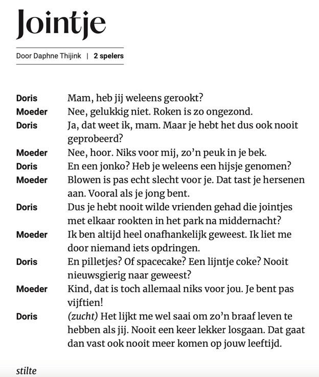 Voor iedereen die op zoek is naar toneelteksten met diverse personages in uiteenlopende situaties op verschillende locaties. De teksten zijn herkenbaar, ontroerend, grappig en soms ongemakkelijk.